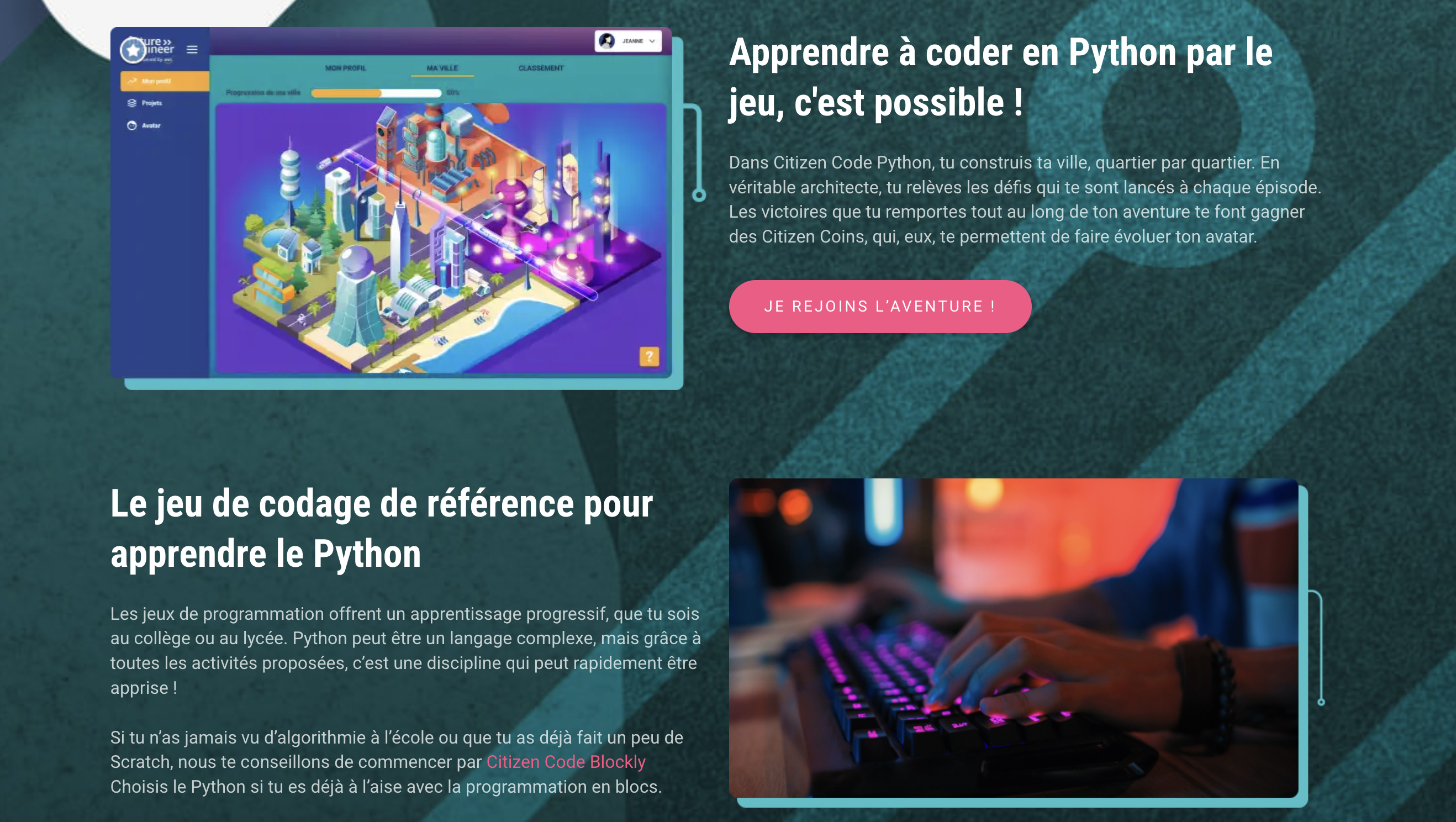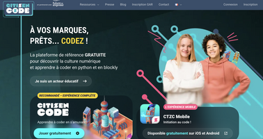 Citizen Code Python est une application en ligne dédiée à l’apprentissage de l’algorithmique et de la programmation, du collège au lycée. Elle propose des parcours scénarisés sous forme de saisons, composées d’épisodes et de missions progressives, en lien avec les programmes scolaires de mathématiques. Les élèves relèvent des défis en programmant soit en Blockly (programmation par blocs), soit en Python (programmation textuelle).