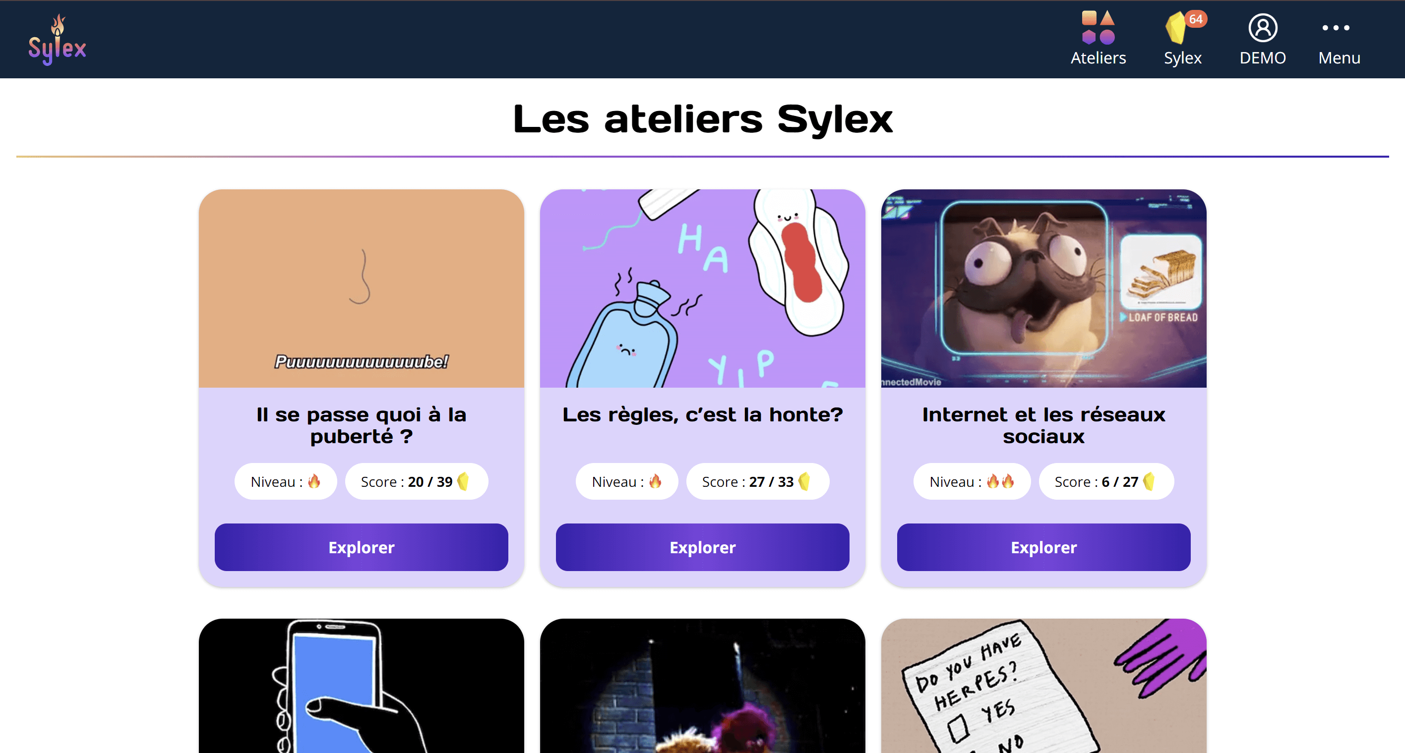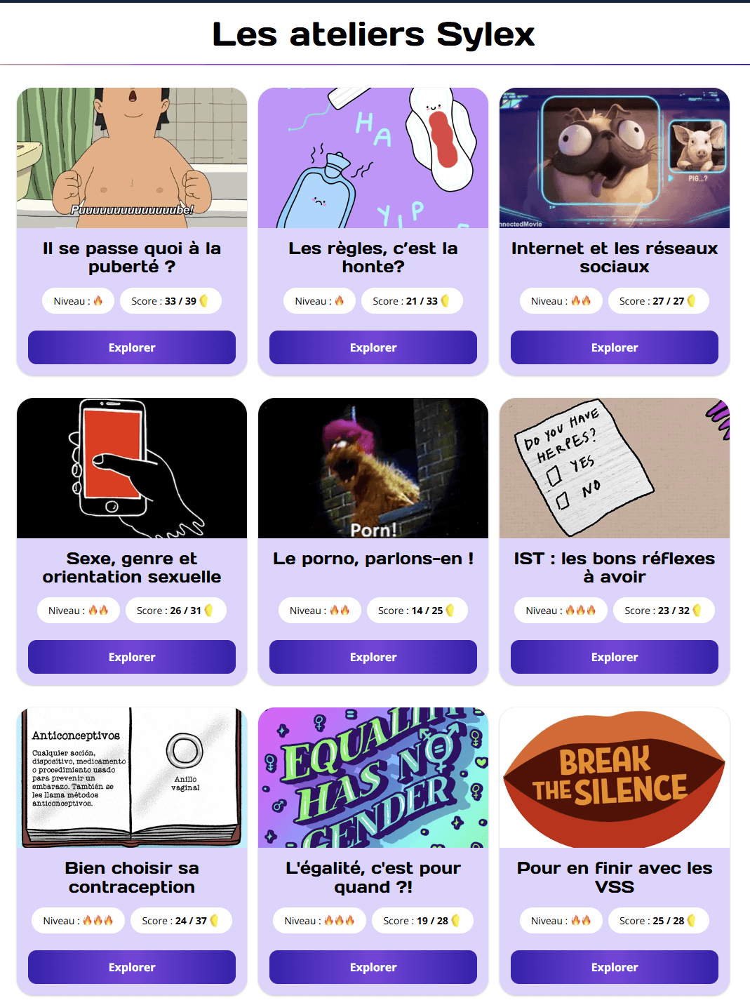 Sylex est une plateforme pédagogique interactive dédiée à l’éducation à la sexualité et à la citoyenneté numérique. Conçue pour accompagner les enseignants dans l’animation de débats en classe, elle propose des ressources variées (vidéos, quiz, textes, jeux comme les Momélés) sur des thématiques essentielles telles que la puberté, le consentement, l’intimité en ligne ou encore la prévention des cyberviolences.