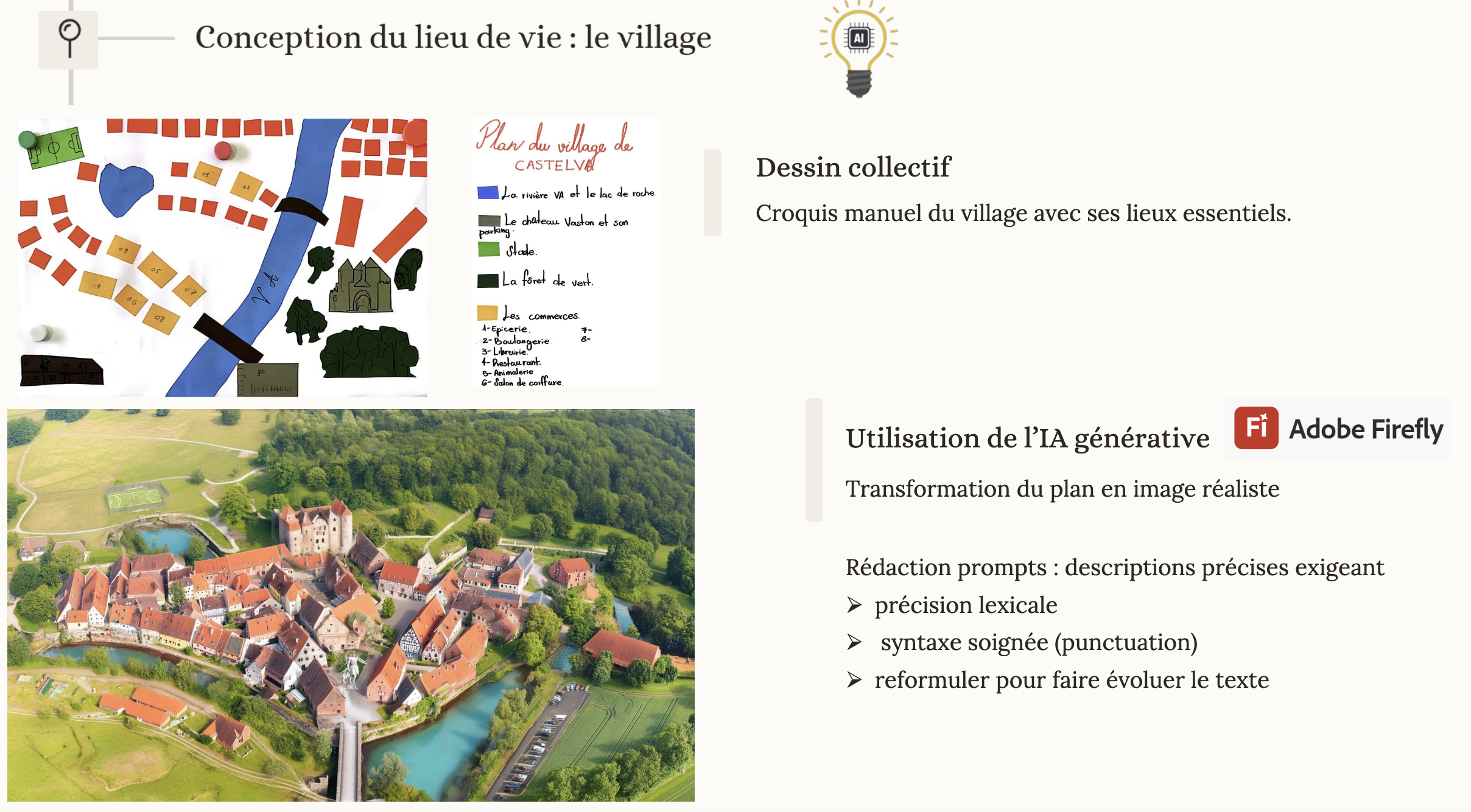- Écriture et enrichissement des descriptions : chaque groupe rédige des descriptions précises des personnages, des lieux ou des événements du village (campagne électorale, fête locale, repas au restaurant…). À cette étape, les élèves utilisent l’IA générative textuelle pour améliorer la précision lexicale, corriger la syntaxe, et reformuler les phrases. L’enseignante les guide dans la rédaction de prompts clairs et détaillés, favorisant ainsi une prise de conscience linguistique : bien formuler sa demande devient un exercice de grammaire et de vocabulaire à part entière.